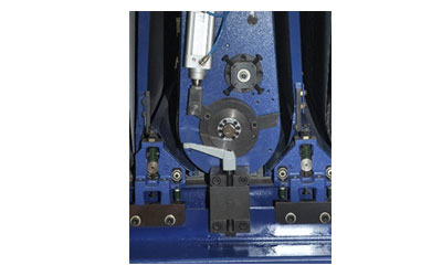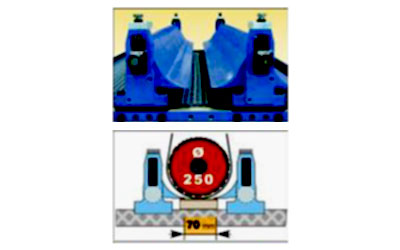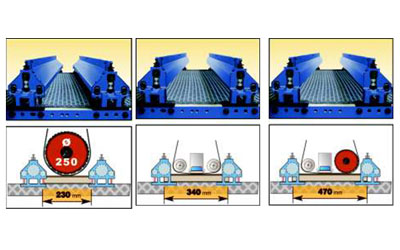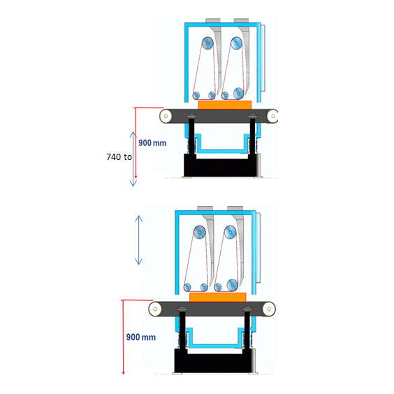 Frame Movable (in line machine) : In this case the feed table height is constant at 900 mm and the frame moves up and down to compensate for the work piece thickness. This feature is optional and is required in factories where the machine is used in line with other production / finishing machines and were handling systems like conveyors are used.